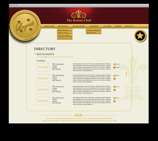 Design of web site including overall identity, style, buttons, layout. Programming and migration is made by Underdog Ltd. Client: The Button Club, Members' club, London.