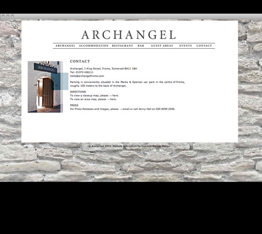 Design of web site for Archangel Hotel & Restaurant. Corpoate Identity: stationery incl letterheads, comp slips, invitations, advertising, signage. Client: Archangel Hotel